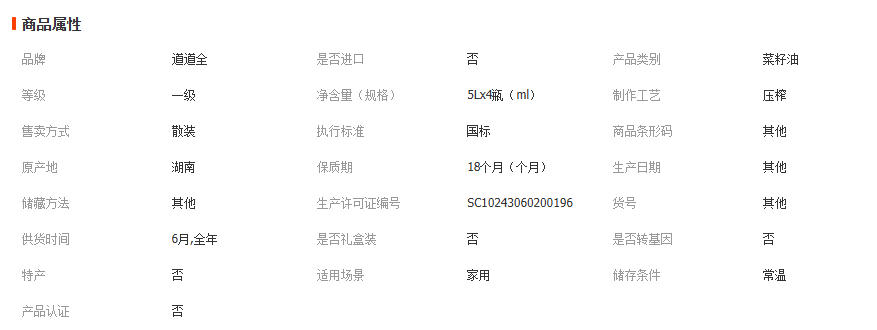 5L*4瓶 道道全双低压榨菜籽油5Lx4瓶物理压榨清香纯正菜籽油 1箱