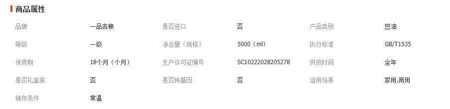 一品吉粮 纯香一级大豆油色拉油植物食用油 5L/桶 1桶