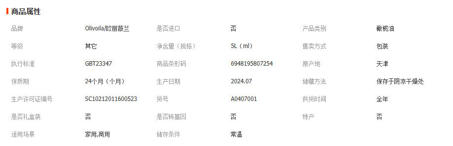 欧丽薇兰纯正橄榄油5L 大桶进口原材料纯压榨橄榄油 适合中式烹饪 2桶