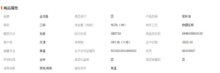 【非转基因 物理压榨】金龙鱼外婆乡小榨菜籽油5L 家用商用食用油 1桶
