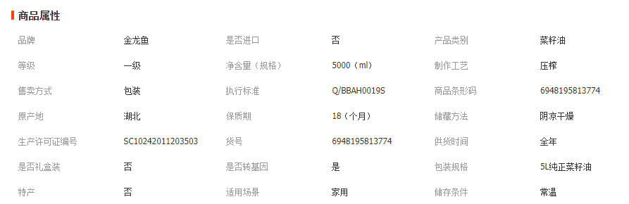 金龙鱼纯正菜籽油5L非转压榨煎炸炒菜食用油大桶装家用菜油5升