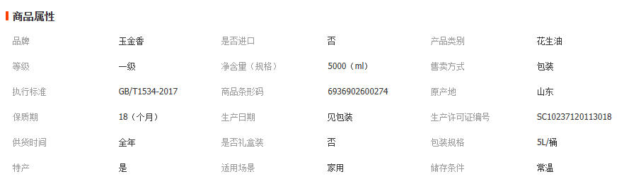 山东玉金香炒香花生油5升物理压榨炒糁出香一级花生油