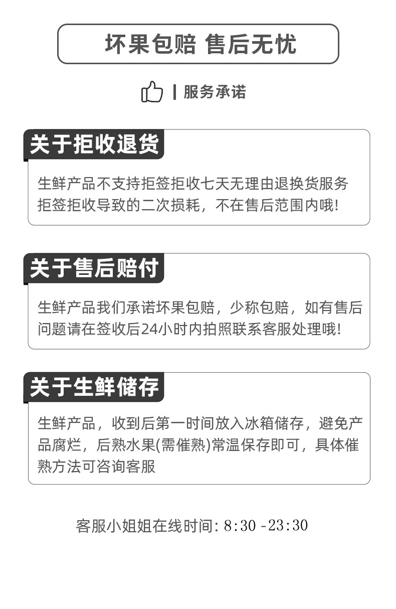 1.水果是易烂果,签收12小时内反馈烂果情况,按比例赔付坏果部分,超时不售后,以快递公司系统显示的签收时间为准,